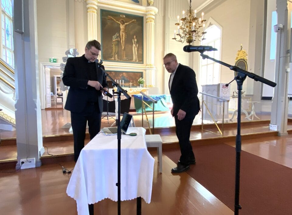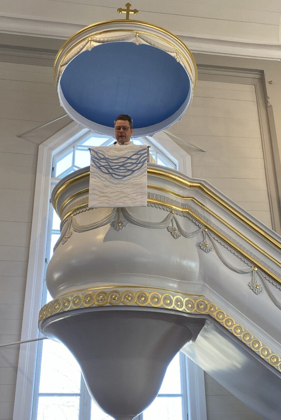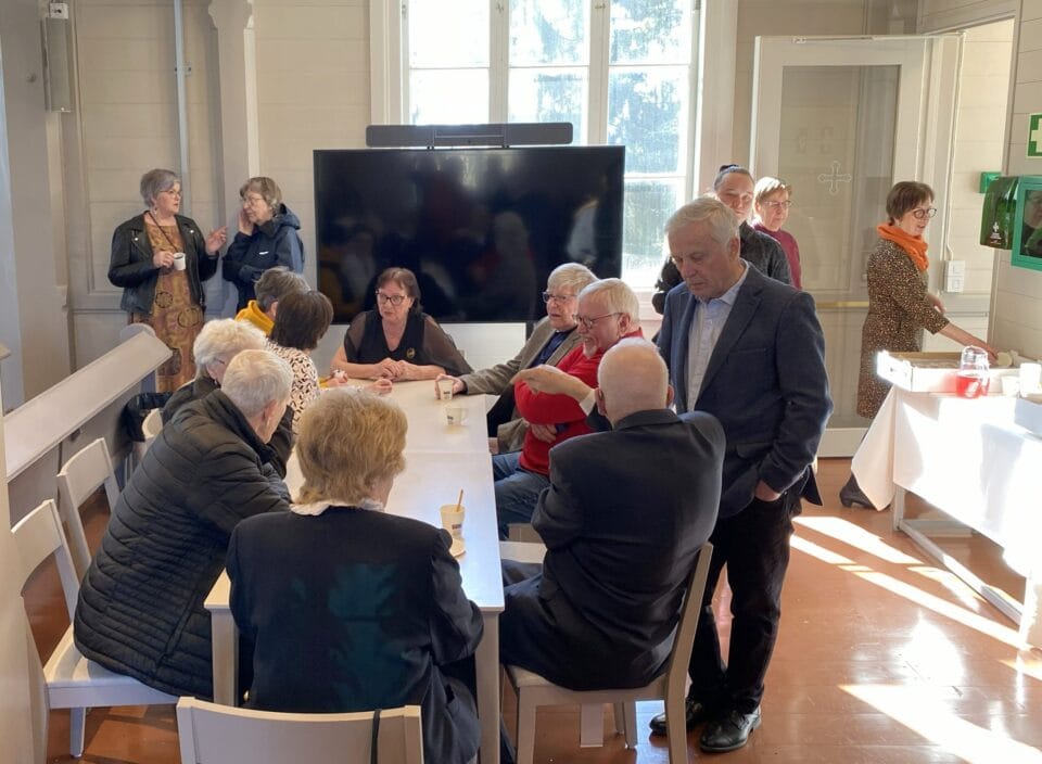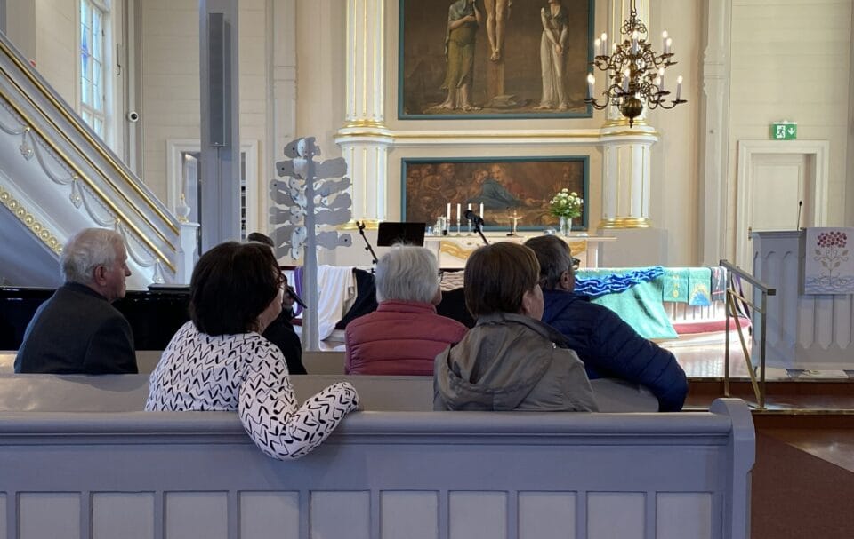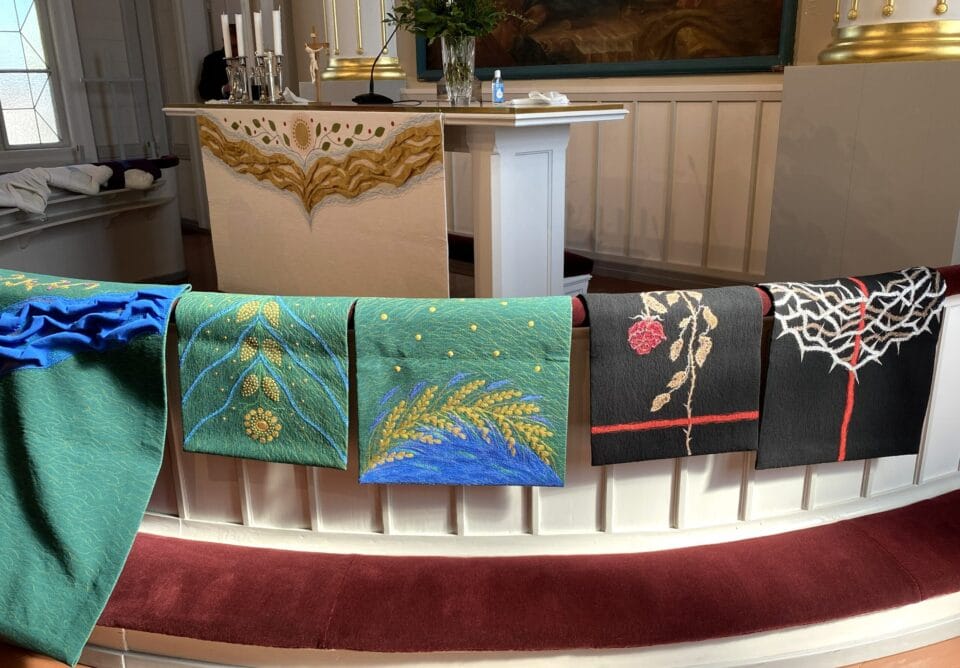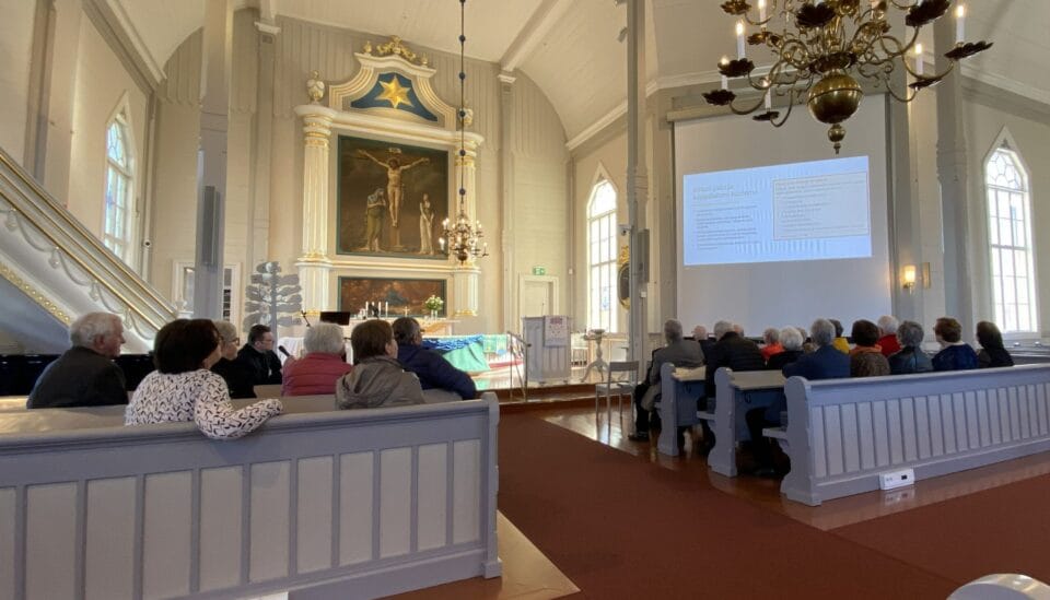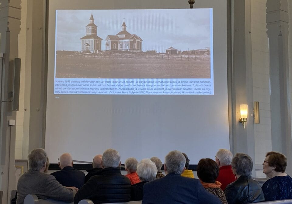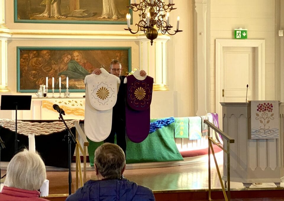 Kirkkokahvien jälkeen oli järjestetty PowerPoint esitys kirkon ja seurakunnan eri vaiheista ja esiteltiin Helena Vaarin suunnittelemia kirkkotekstiilejä.