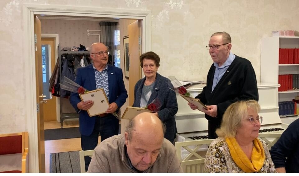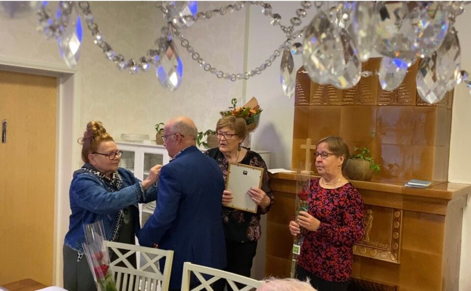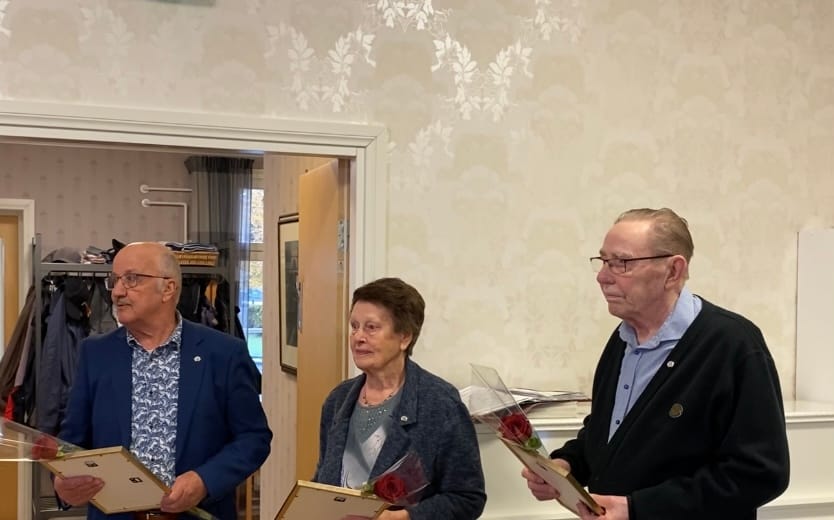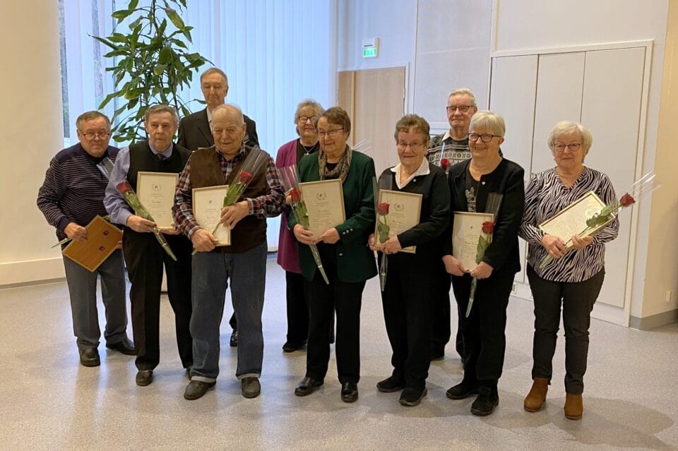 Hopeisen ansiomerin vastaanottivat: Arja Huuki,( hän oli estynyt saapumaan ) Irja Halkosaari, Pentti Kuusisto ja Heikki Ketopaikka. Kultainen ansiomerkki myönnettiin yhdistyksemme jäsenelle Mauri Holmalle kesällä Keski-Pohjanmaan piirin 50 vuotisjuhlassa Kaustisella.